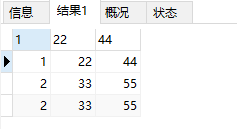 SELECT 1,22,44 UNION SELECT 2,33,55 UNION ALL SELECT 2,33,55